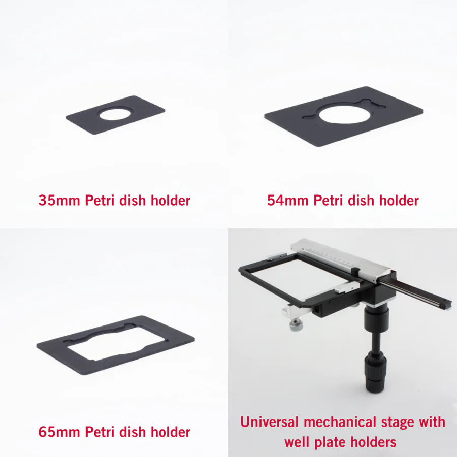 - Halterung für 35 mm, 54 mm und 65 mm Petrischalen